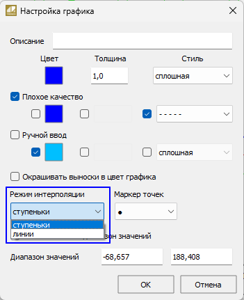 Чтобы выбрать режим интерполяции графиков, вызовите окно Настройки графика двойным щелчком по отображению любого сигнала в легенде и в выпадающем списке поля Режим интерполяции укажите нужный режим.