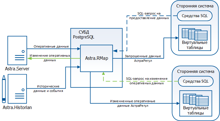 RMAP выступает интерфейсом для взаимодействия PostgreSQL и Astra.Historian.