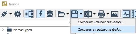 Чтобы сохранить данные по сигналам в файл, нажмите кнопку Сохранить в файл на панели инструментов, в контекстном меню выберите Сохранить графики в файл...