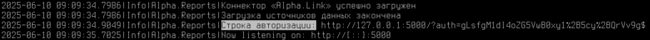 <Дата> <Время>|Info|Alpha.Reports|Строка авторизации: http://127.0.0.1:5000/?auth=<Строка авторизации>