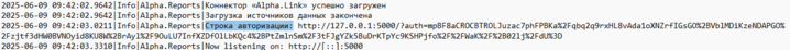 <Дата> <Время>|Info|Alpha.Reports|Строка авторизации: http://127.0.0.1:5000/?auth=<Строка авторизации>