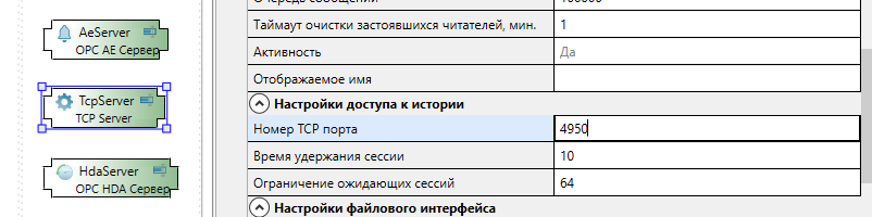 Выделите TCP-сервер и в окне "Свойства" выставите порт 4950.