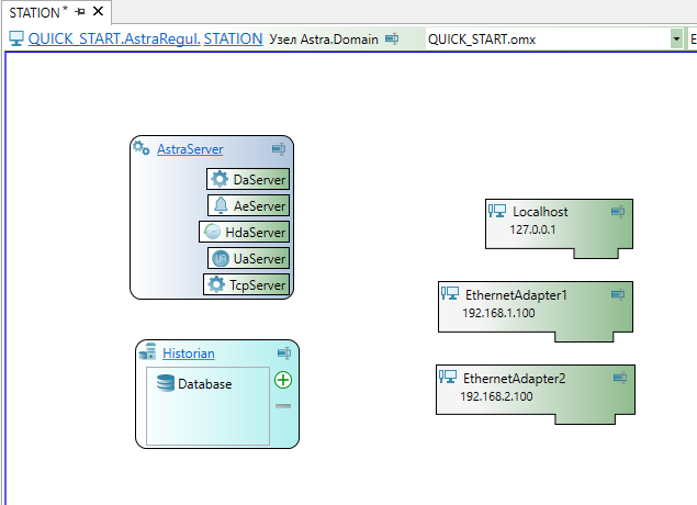 Перетащите в рабочую область узла домена из "Панели элементов" компонент "Astra.Historian".