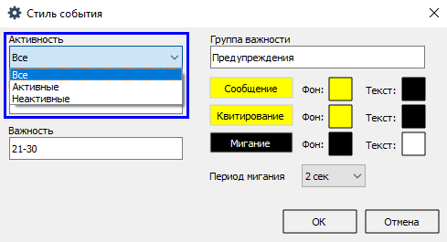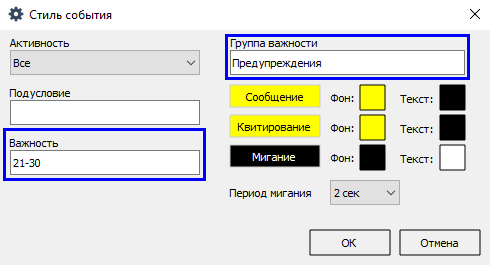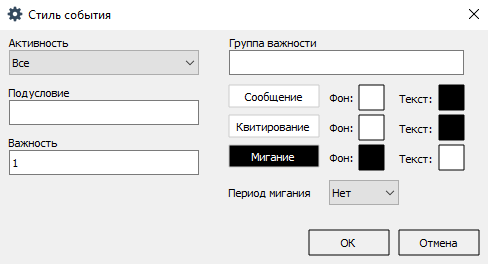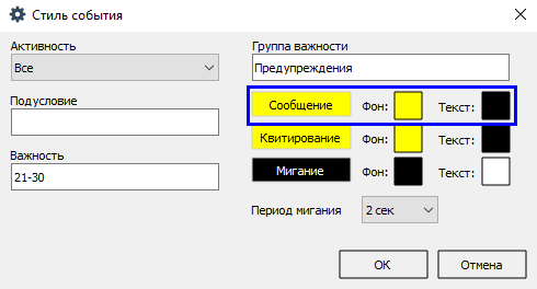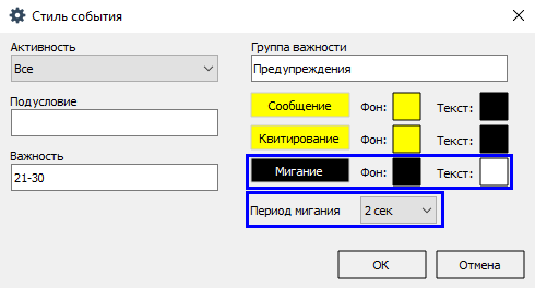 5. Дополнительно к цвету строки сообщений для оперативного режима вы можете включить мигание цвета и текста строки (поля Фон и Текст), а также задать период мигания (поле Период мигания).