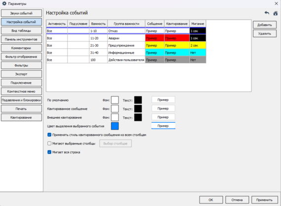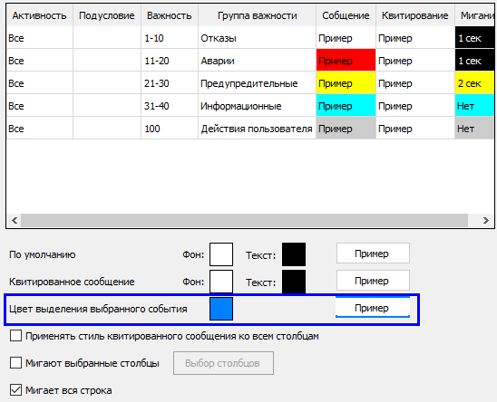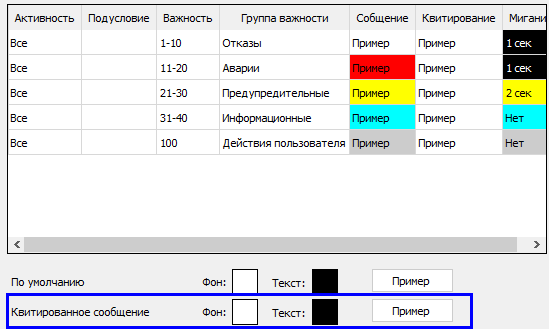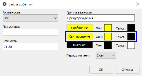 6. При квитировании события строка с сообщением перестает мигать, но вы можете настроить фон строки и цвет текста квитированного сообщения о событии (поля Фон и Текст).