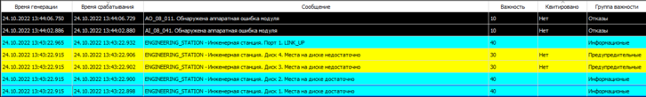 На рисунке ниже показана цветовая сигнализация для событий трех групп важности (отказы, информационные и предупредительные), которые определил пользователь.