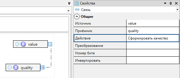 2. Протяните связь от сигнала, в который записывается качество, к сигналу в который записывается значение. У связи в свойстве Действие выберите «Сформировать качество» или «Сформировать качество с инверсией».