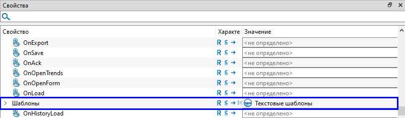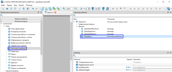 Чтобы добавить экземпляр типа Текстовые шаблоны в проект, перетяните тип на рабочую область. Компонент невизуальный и отображается в области Структура объекта.
