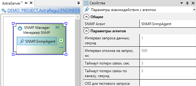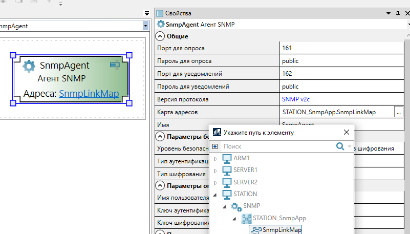 8. Выделите Агент SNMP. В свойствах элемента укажите добавленную карту адресов и параметры агента: порты для опроса и уведомлений, версию протокола и т.д.