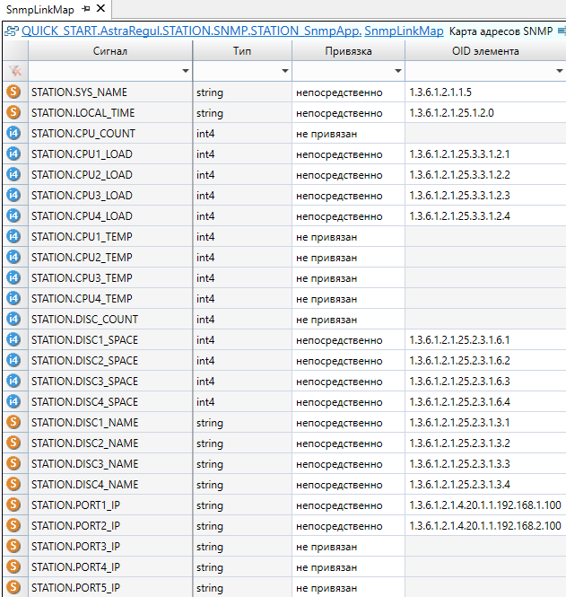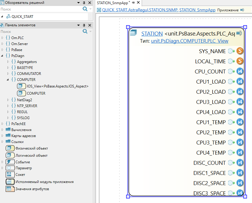 Для диагностики станции необходимо добавить в приложении "STATION_SnmpApp" тип "COMPUTER" из библиотеки "PsDiagn" и заполнить карту адресов. Все остальные компоненты инженерной станции настраиваются автоматически с помощью плагина AstraRegul.