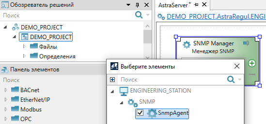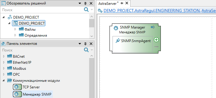 15. Чтобы АРМ инженера могла собирать диагностические данные со всех устройств по SNMP, перейдите в "Astra.Server" инженерной станции и перетащите из "Панели элементов" в рабочую область компонент "Менеджер SNMP".