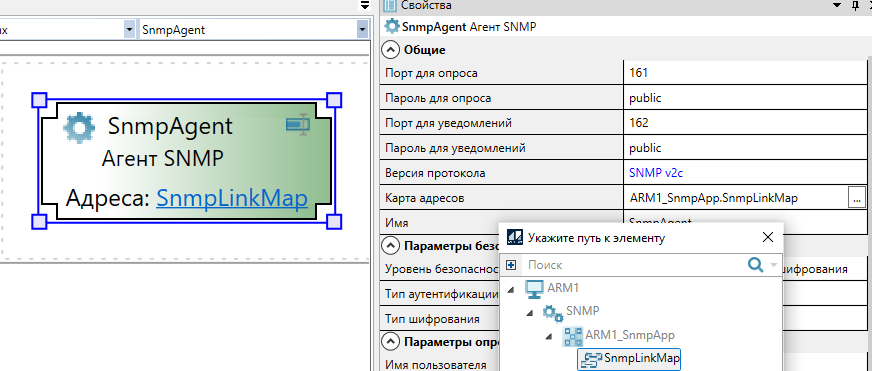 10. Выделите "Агент SNMP". В свойствах элемента укажите добавленную карту адресов и параметры агента: порты для опроса и уведомлений, версию протокола и т.д.