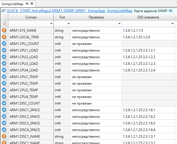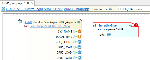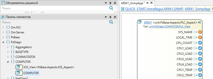 После экспорта необходимо добавить в приложении "ARM1_SnmpApp" тип "COMPUTER" из библиотеки "PsDiagn" и заполнить карту адресов. Все остальные компоненты ARM настраиваются автоматически с помощью плагина AstraRegul.