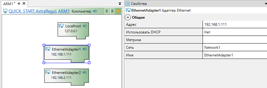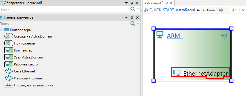 2. Перейдите в элемент "Компьютер" и перетащите в рабочую область из "Панели элементов" необходимое количество Ethernet-адаптеров в соответствии с физическими адаптерами АРМ оператора.