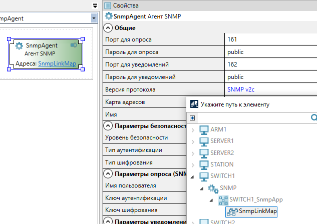 8. Выделите Агент SNMP. В свойствах элемента укажите добавленную карту адресов и параметры агента: порты для опроса и уведомлений, версию протокола и т.д.