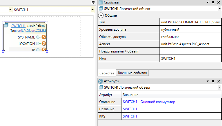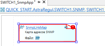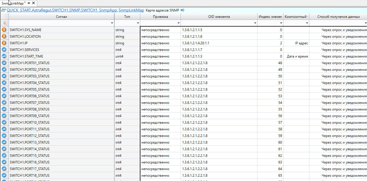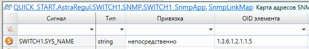 После экспорта необходимо добавить в приложении "SWITCH1_SnmpApp" тип "COMMUTATOR" из библиотеки "PsDiagn" и заполнить карту адресов. Все остальные компоненты коммутатора настраиваются автоматически с помощью плагина AstraRegul.