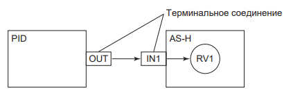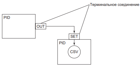 На рисунке, приведенном ниже, показано соединение между выходом OUT предшествующего функционального блока и входом SET последующего функционального блока при каскадном управлении. Из данного примера видно, что два терминала в/в соединены терминальным соединением.