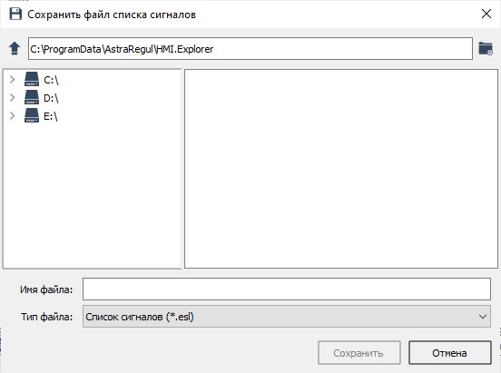 Список сигналов и информацию о них можно сохранить в json-формате в файл в с расширением *.esl. Для этого нажмите "Сохранить список сигналов в файл" на панели инструментов.