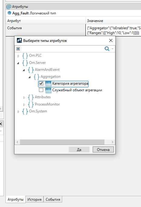 Если агрегаторы по ветке должны агрегировать события разных объектов ветки, добавьте созданному типу атрибут Категория агрегатора (Om.Server –> AlarmAndEvent -> Aggregation). Значение можно оставить пустым, либо указать любое значение по умолчанию. Агрегаторам этого типа, находящимся в разных объектах одной ветки, можно будет указать разные названия категорий агрегатора. Тогда агрегаторы разных категорий будут агрегировать события с разных объектов одной ветки.