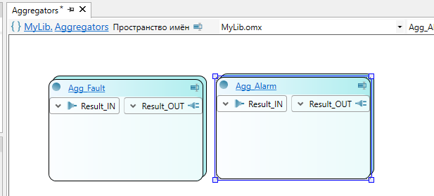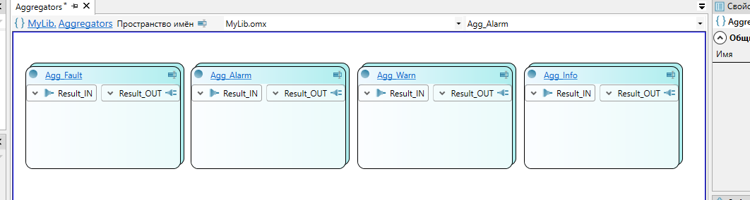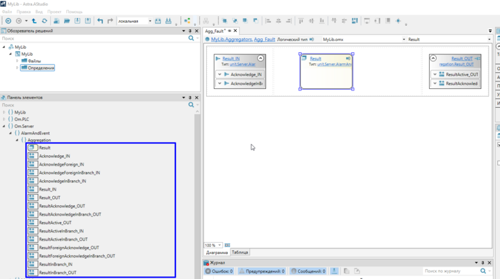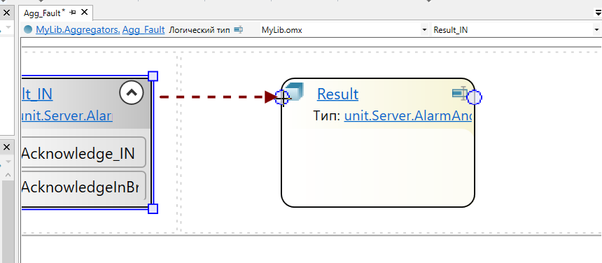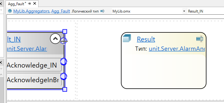 10. Добавьте в логический тип элементы-сокеты из набора Om.Server.AlarmAndEvent.Aggregation и элемент Result из панели элементов.