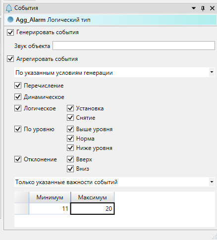13. Выделите агрегатор "Agg_Alarm" и в окне "События" укажите диапазон важностей в соответствии с цветовой схемой для журнала событий.
