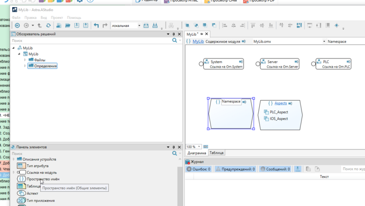 2. Добавьте на рабочую область "Пространство имен" из панели элементов путем перетаскивания.