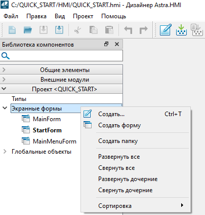 1. Кликните правой кнопкой мыши по вкладке "Экранные формы" и в контекстном меню выберите команду "Создать форму".