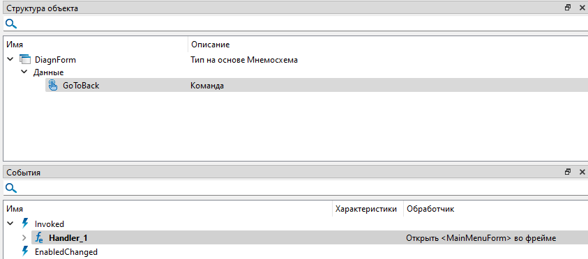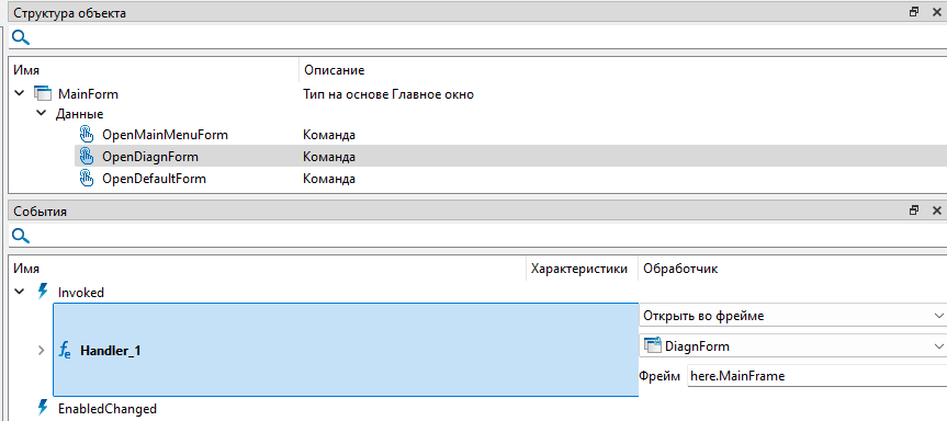 10. Перейдите на экранную форму "MainForm" и с помощью контекстного меню добавьте обработчик события "Invoked" для команды "OpenDiagnForm".