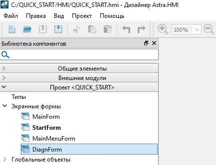 2. Во вкладке "Экранные формы" переименуйте созданную форму в "DiagnForm".