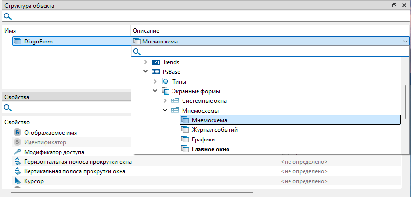 3. Измените тип экранной формы двойным кликом левой кнопки мыши по полю "Описание". В выпадающем списке выберите "Внешние модули" → "PsBase" → "Экранные формы" → "Мнемосхемы" → "Мнемосхема" и нажмите клавишу "Enter".