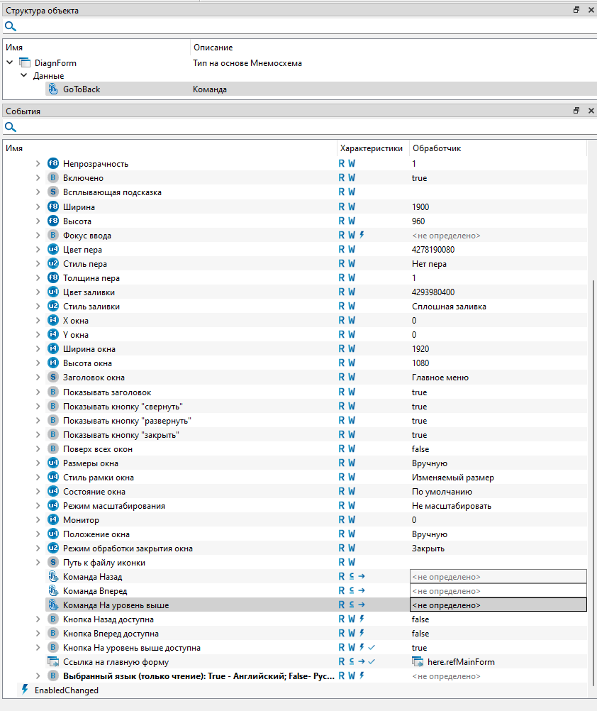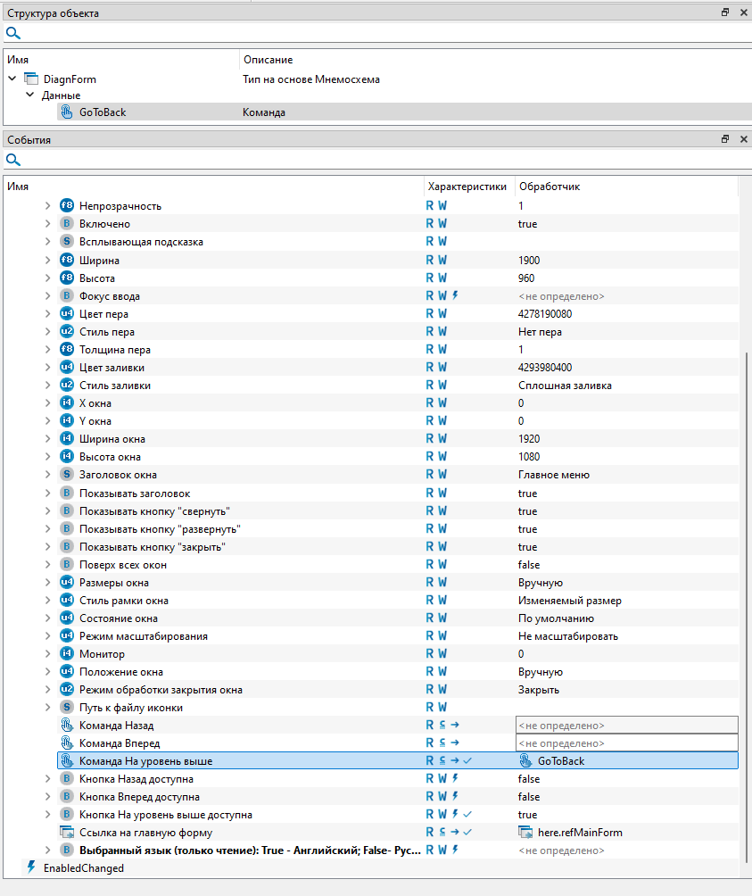 11. Раскройте обработчик и задайте свойству "Ссылка на главную форму" значение "here", укажите ссылку у свойства "Команда на уровень выше" на созданную команду "GoToBack".