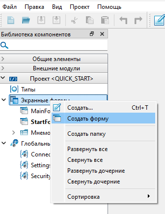 1. Кликните правой кнопкой мыши по вкладке "Экранные формы" и в контекстном меню выберите команду "Создать форму".