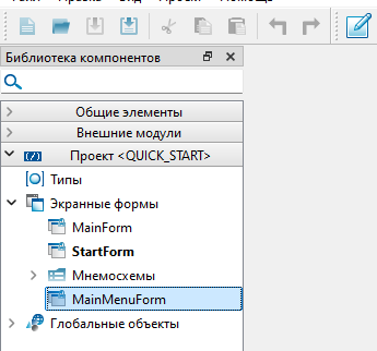 2. Во вкладке "Экранные формы" переименуйте созданную форму в "MainMenuForm".