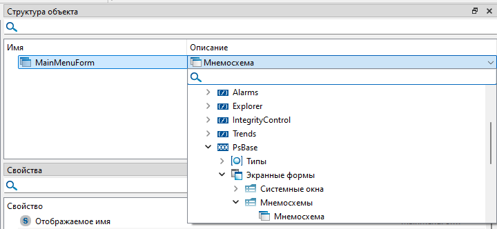 3. Измените тип экранной формы двойным кликом левой кнопки мыши по полю "Описание". В выпадающем списке выберите "Внешние модули" → "PsBase" → "Экранные формы" → "Мнемосхемы" → "Мнемосхема" и нажмите клавишу "Enter".