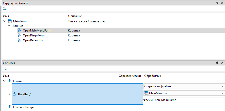 6. Перейдите на экранную форму "MainForm". С помощью контекстного меню добавьте обработчик события "Invoked" для команды "OpenMainMenuForm".