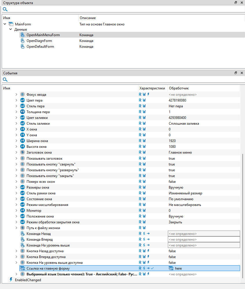 7. Раскройте обработчик и задайте свойству "Ссылка на главную форму" значение "here". Нажмите клавишу Enter. Задайте для обработчика следующие свойства: