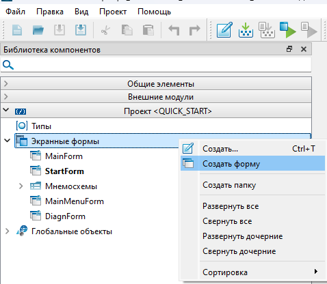 1. Кликните правой кнопкой мыши по вкладке "Экранные формы" и в контекстном меню выберите команду "Создать форму".