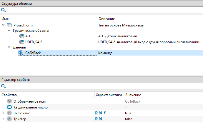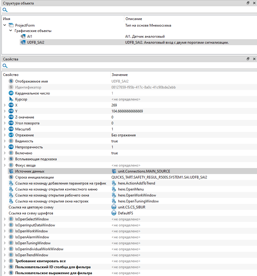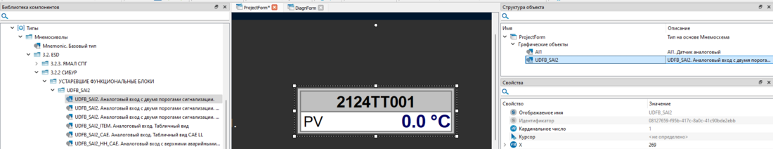 7. Добавьте на экранную форму "ProjectForm" библиотечный тип "UDFB_SAI2. Аналоговый вход с двумя порогами сигнализации" библиотеки "PsSIS" из вкладки "Внешние модули". Уберите хвост "_1" в названии объекта.
