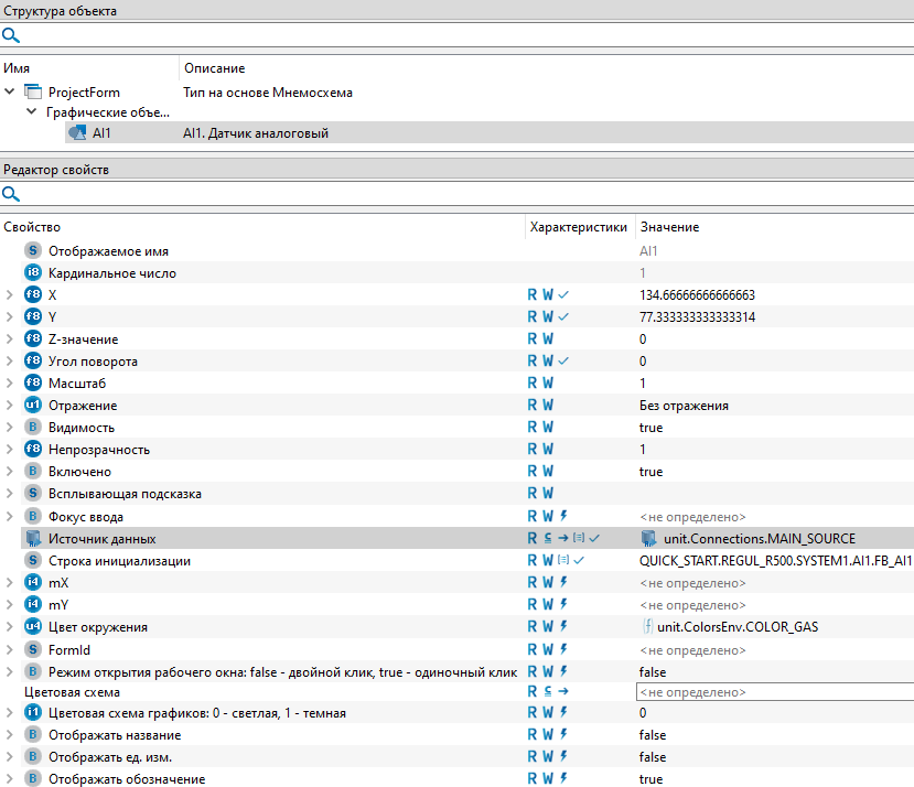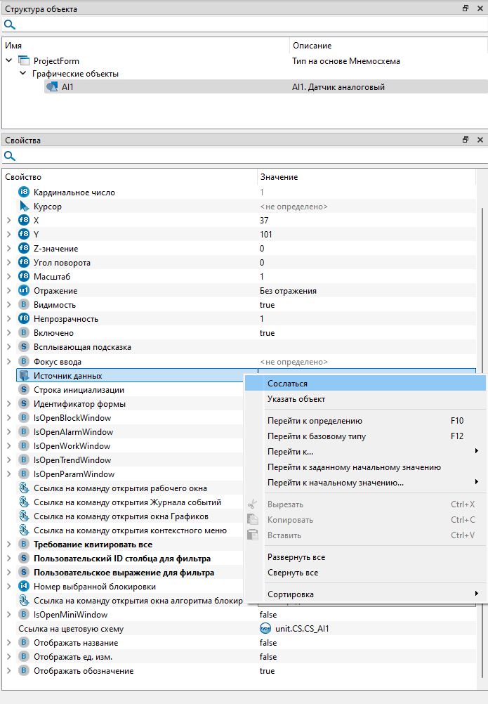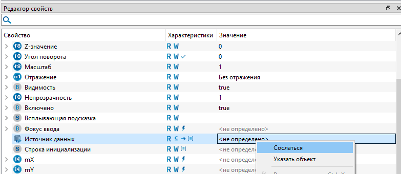 Источник данных – кликните правой кнопкой мыши по свойству и выберите из контекстного меню команду "Cослаться". Затем укажите путь к элементу "MAIN_SOURCE" из глобального объекта "Connections": unit.Connections.MAIN_SOURCE.