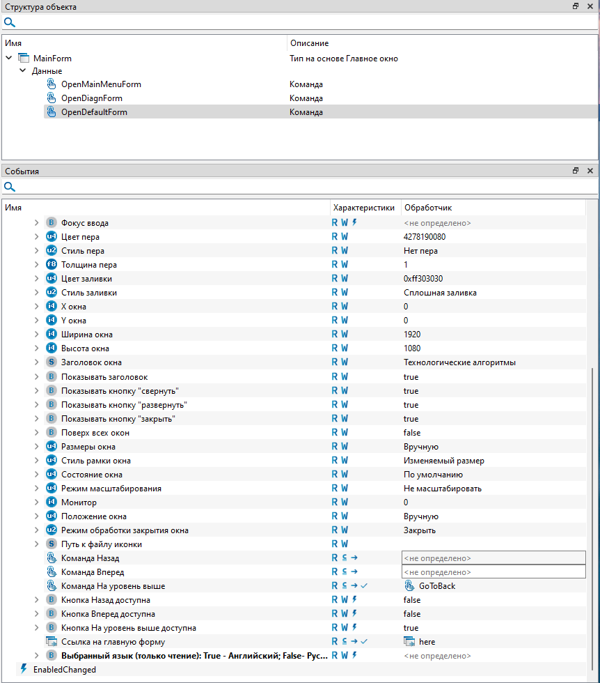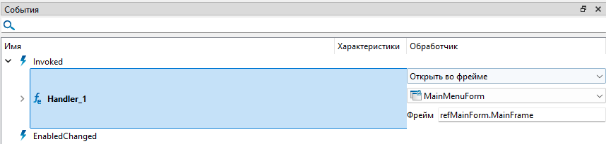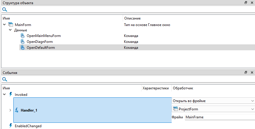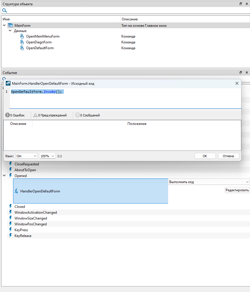 Для события "Opened" экранной формы "MainForm" добавлен вызов команды открытия экранной формы "OpenDefaultForm". При открытии окна "Главной формы" будет активироваться событие "Invoked" команды "OpenDefaultForm".