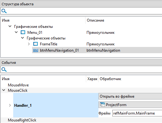 13. Перейдите на экранную форму "MainMenuForm" и настройте событие "MouseClick" у кнопки "btnMenuNavigation_01" следующим образом: