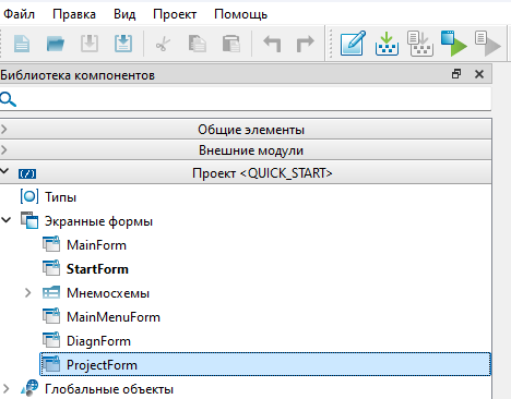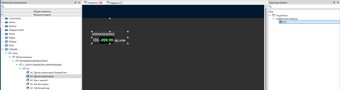 5. Добавьте на экранную форму "ProjectForm" библиотечный тип "AI1. Датчик аналоговый" библиотеки "PsTechEE" из вкладки "Внешние модули". Уберите хвост "_1" в названии объекта.