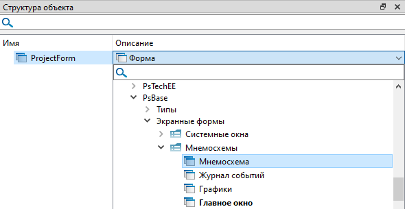 3. Измените тип экранной формы двойным кликом левой кнопки мыши по полю "Описание". В выпадающем списке выберите "Внешние модули" → "PsBase" → "Экранные формы" → "Мнемосхемы" → "Мнемосхема" и нажмите клавишу "Enter".