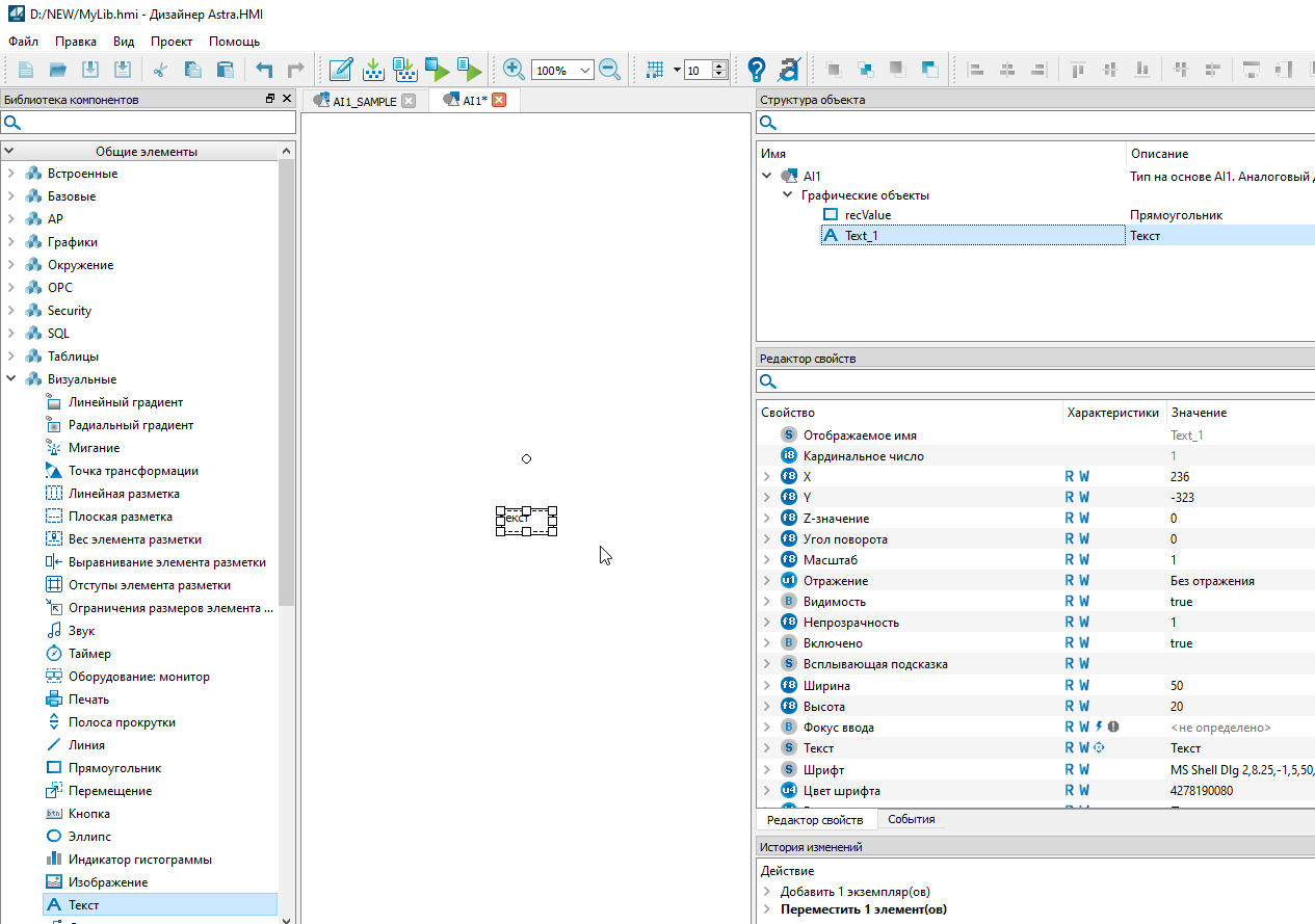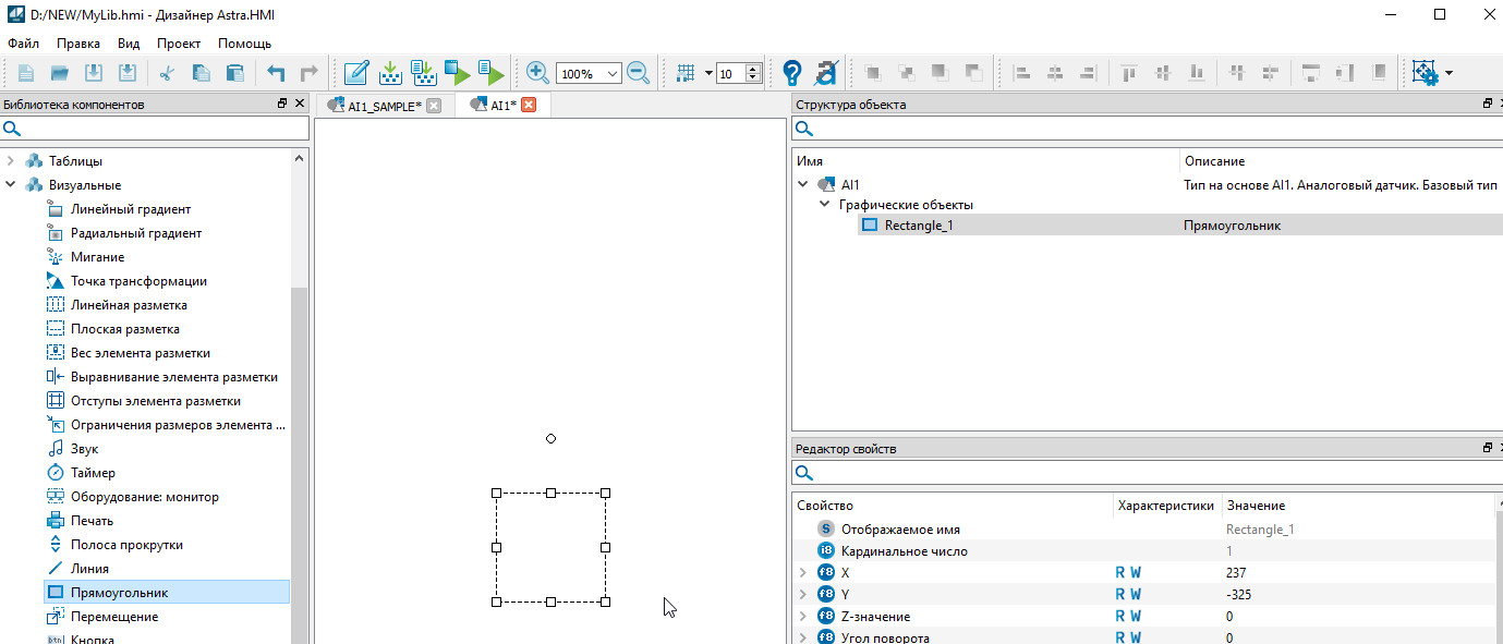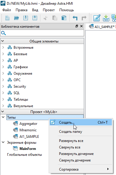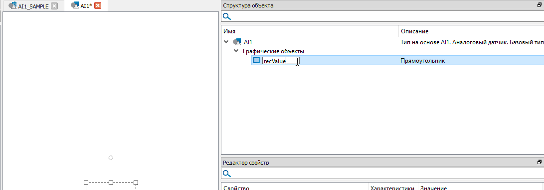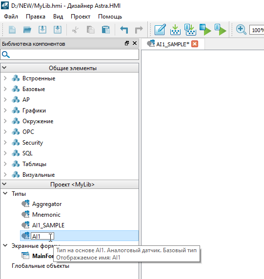 3. Во вкладке "Типы" появится новый графический объект с именем "AI1_SAMPLE_1". Выделите тип левой кнопкой мыши, нажмите клавишу "F2" и задайте имя "AI1"