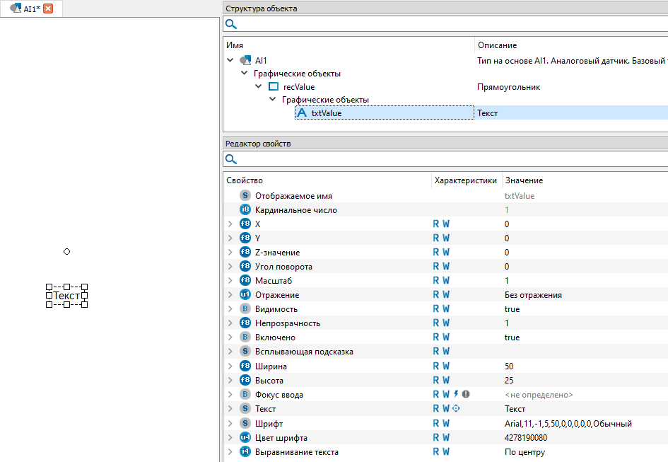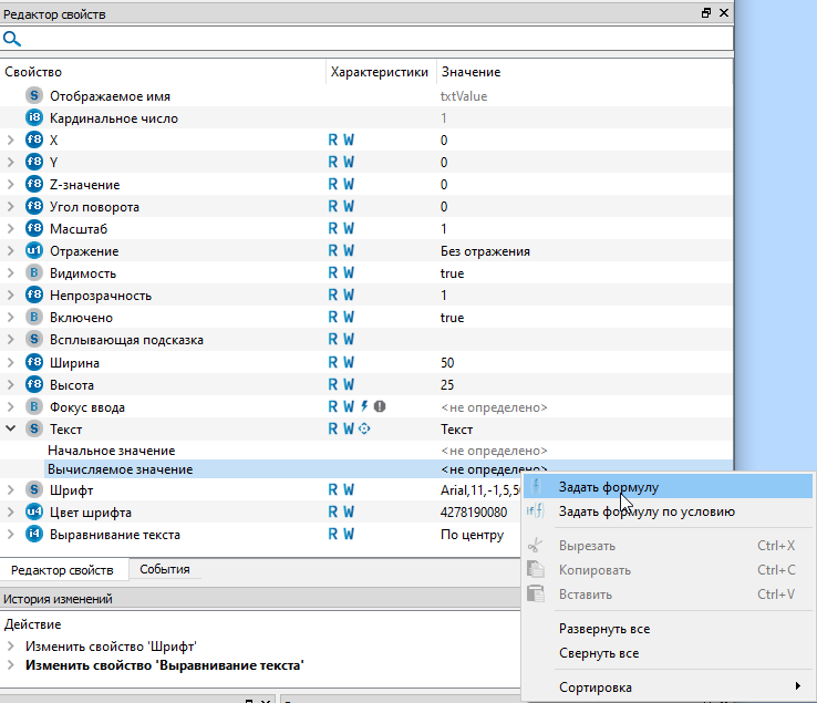 13. Посредством визуальных типов можно отображать состояние алгоритма или его текущие значения, для того чтобы в поле текст отображалось значение с выхода алгоритма аналогового датчика (AI1) раскойте крыжик у свойства текст и нажмите правой кнпокой мыши по строчке "Вычисляемое значение". Из контекстного меню выберите команду "Задать формулу".