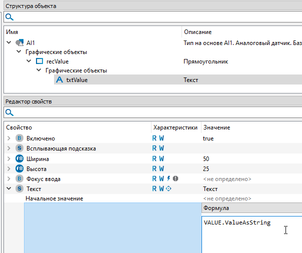 14. В появившемся окне для ввода впишите следующую формулу "VALUE.ValueAsString" и после нажмите сочетание клавиш "Ctrl+Enter". Таким образом, в режиме исполнения вместо значения "Текст" будет отображаться значение с выхода алгоритма аналогового датчика. Так как свойство имеет тип "string" необходимо обратиться к свойству параметра "VALUE" - "ValueAsString", так как оно представляет значение типа "float" в формате строки.