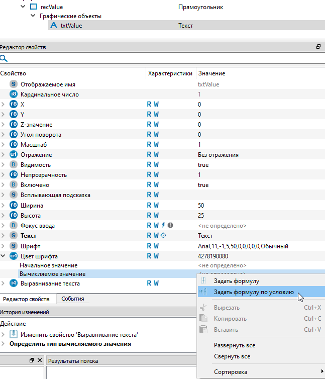 15. Задайте цветовую раскраску шрифта в завистимости от качества выходного сигнала "VALUE". Для этого раскройте крыжик у свойства "Цвет шрифта" и нажмите правой кнпокой мыши по строчке "Вычисляемое значение". Из контекстного меню выберите команду "Задать формулу по условию".