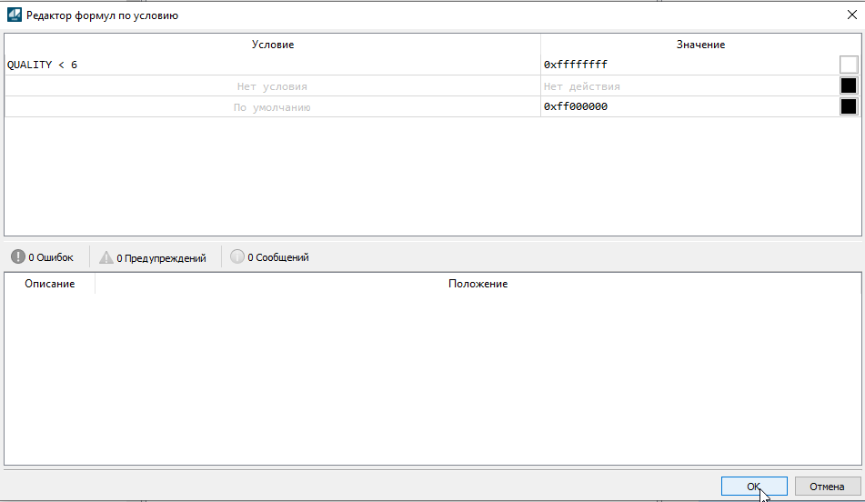 16. Нажмите кнопку "Редактировать..." . В появившемся окне откроется таблица с двумя столбцами "Условие" и "Значение". Соответственно, в столбец условие мы запишем условие для переменной "QUALITY" типа "int4", а в столбец значение запишем значение цвета. Например при значении переменной "QUALITY" меньше 6 цвет шрифта становится белым, а по умолчанию черный. После задания условий нажмите кнопку "ОК".