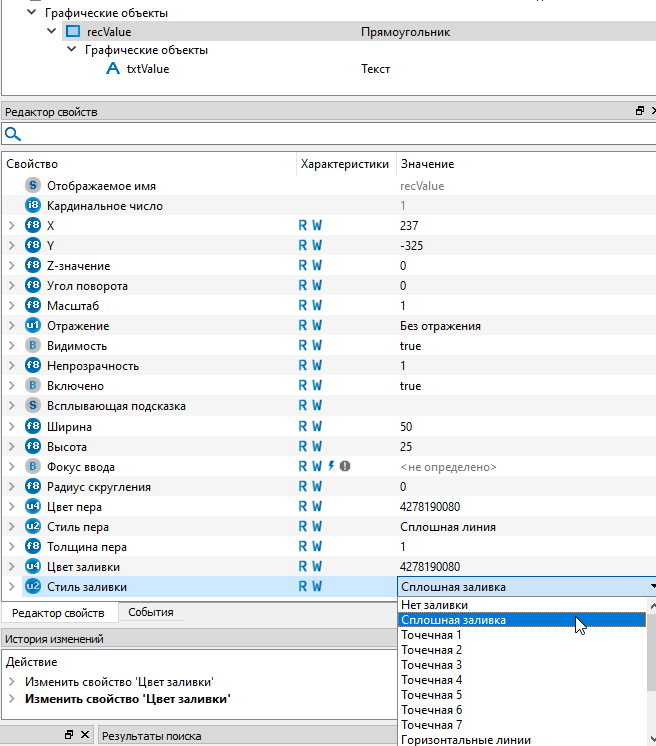17. Измените стиль заливки для типа "recValue" по умолчанию. Для этого выделите тип "recValue" и задайте свойству "Стиль заливки" значение "Сплошная заливка"