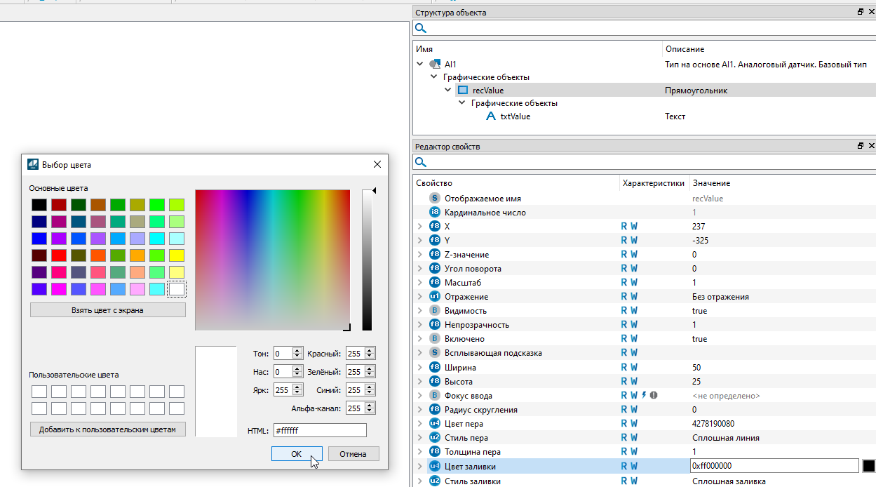 18. Установите по умолчанию былый цвет для заливки, для этого кликните двойным щелчком мыши по полю "Значение" в строке свойства "Цвет заливки". В открывшемся окне выберите цвет в удобном формате и нажмите кнопку "ОК".